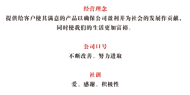 但是,近几年销售额也总是原地踏步,非常困惑于如何提升业绩。在中国要想有更进一步的发展,势必需要客户们给予更多的关照。因此,我们将用心去倾听客户的声音,并有必要把这些声音反映到我们的产品和服务当中去。为此,现在我们正致力于提高我们的技术能力。把「爱、感谢、积极性」的社训体现在每一个员工的身上,以成为任何人都喜欢、魅力四射的公司为目标,并用正直的行动、诚实的对应去实现它。